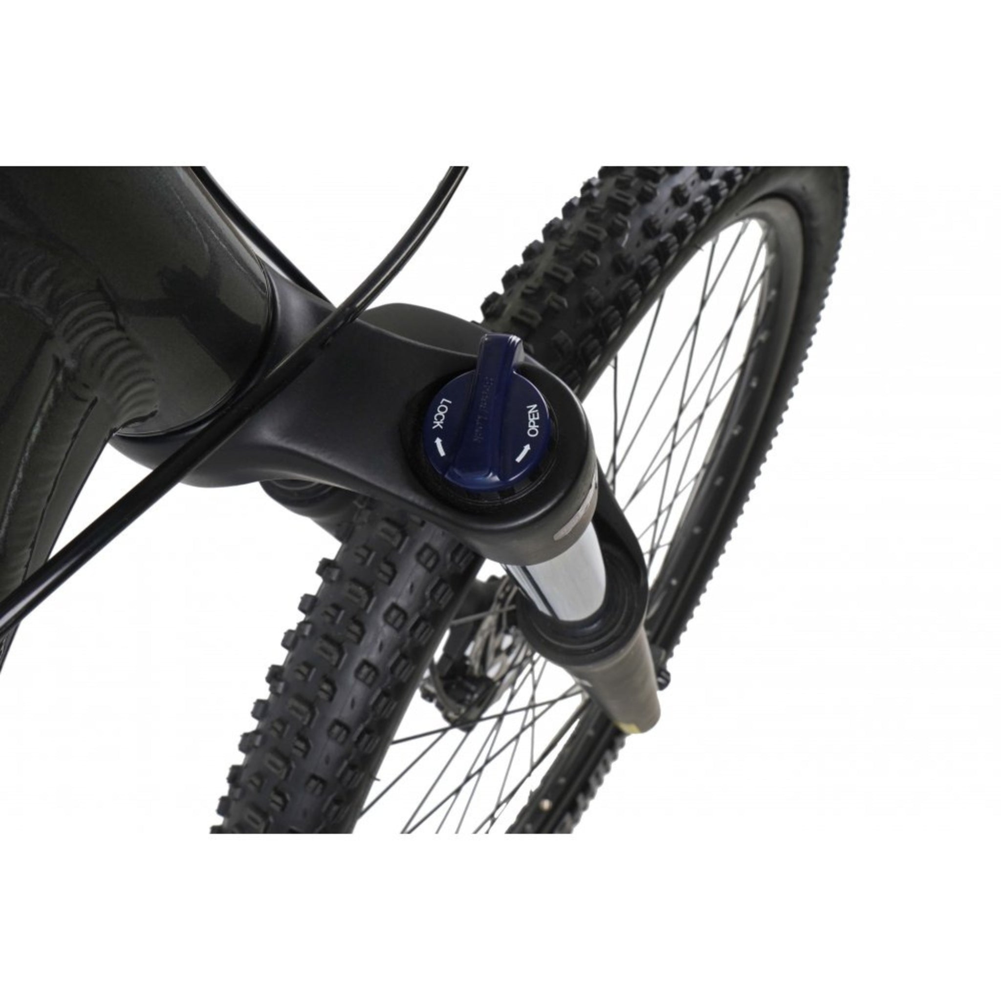 • SR Suntour suspension fork – 100mm travel with hydraulic lockout to absorb rough terrain.