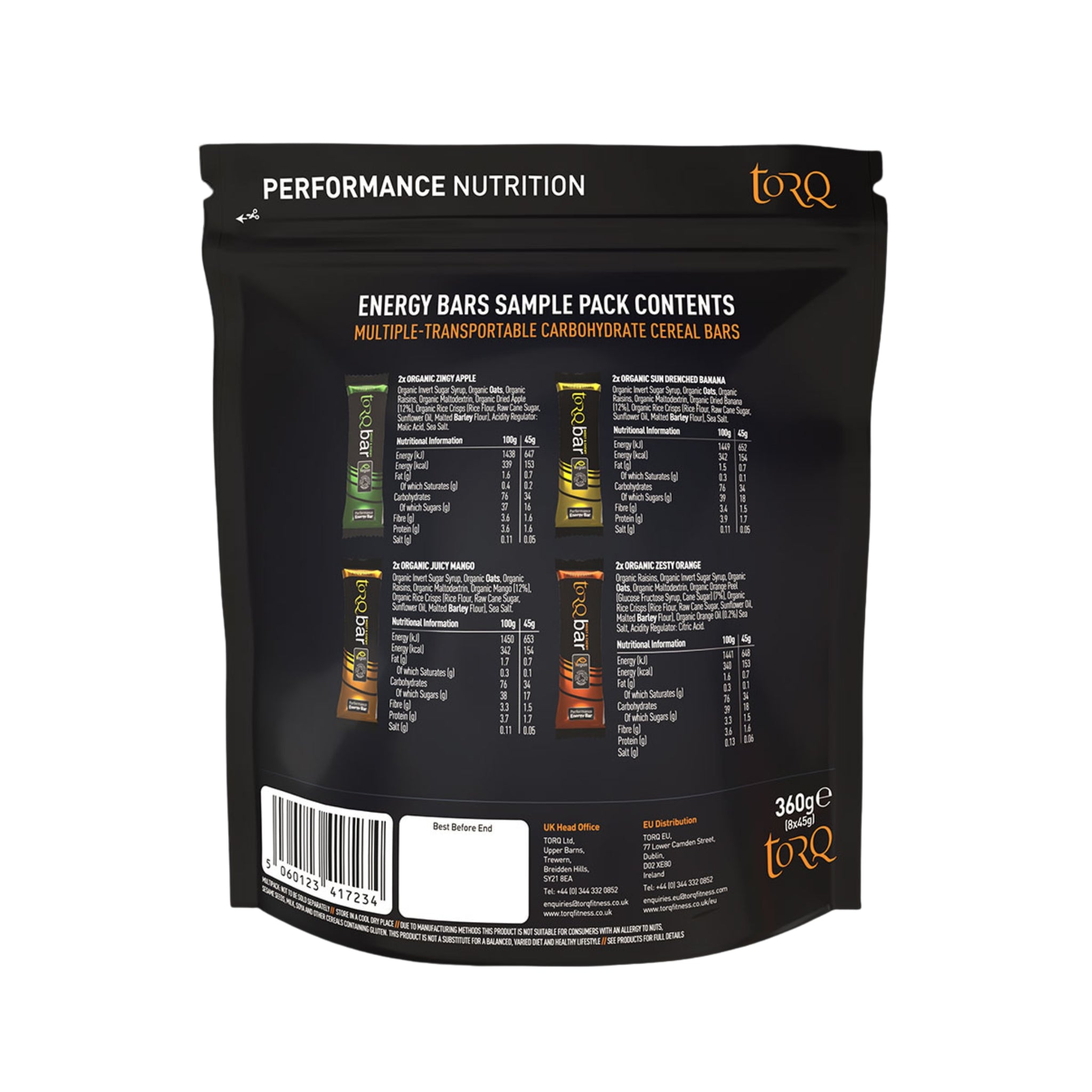 Each 45 g bar delivers one TORQ Unit, equivalent to 30 g of multiple-transportable carbohydrates that are engineered to fuel endurance accurately and efficiently. TORQ’s carbohydrate system—and sample pack—is designed to fit seamlessly into a comprehensive fuelling strategy alongside TORQ’s gels, jellies, and drinks. For optimal performance, the TORQ Fuelling System recommends consuming 2–3 TORQ Units per hour .