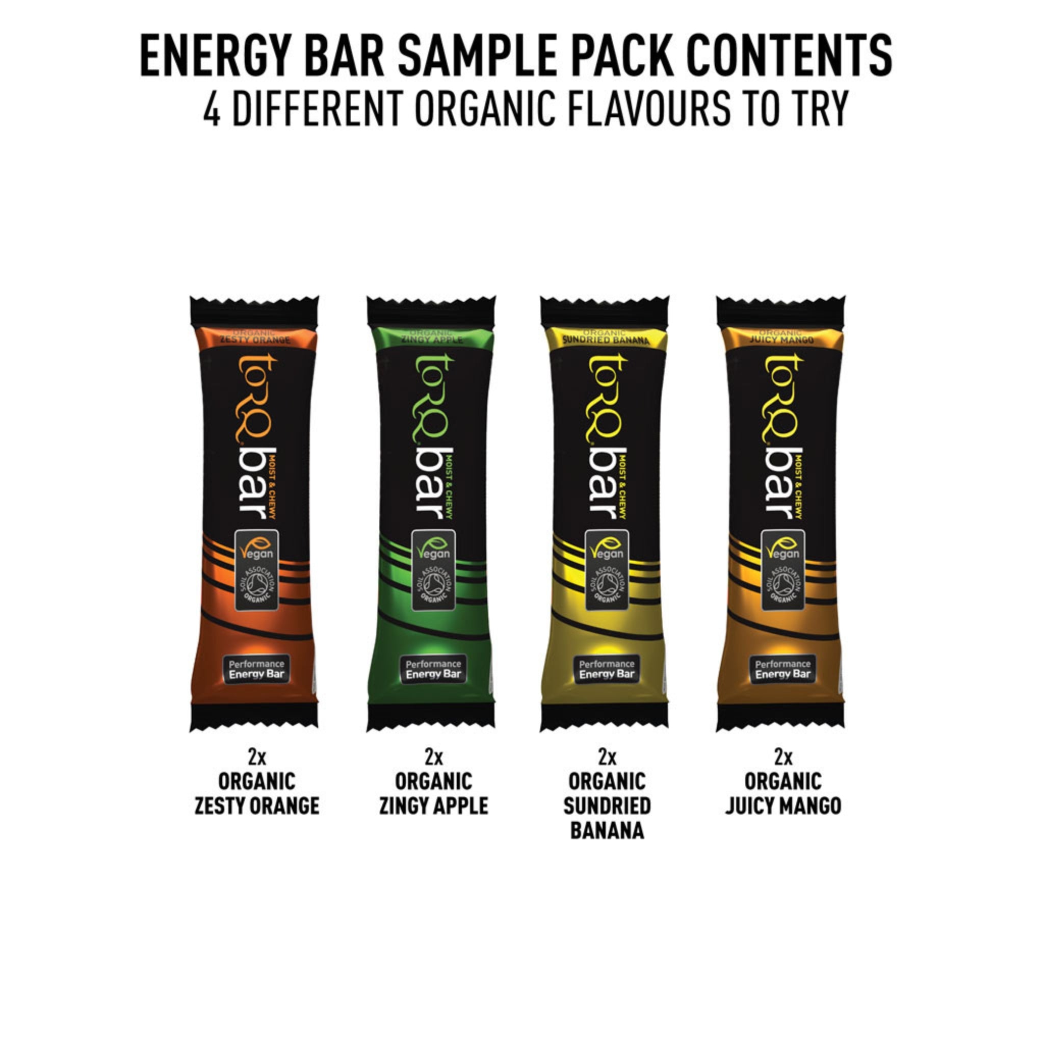 Experience TORQ’s fuel recipe in full with the Organic Bar Sample Pack, containing 8 bars, two of each flavour: Zingy Apple, Sundried Banana, Juicy Mango, and Zesty Orange, all certified organic by the Soil Association. Crafted using organic oats, raisins, maltodextrin, and fruit, these bars deliver a clean, high-performance energy boost with no artificial sweeteners, colours, or preservatives .