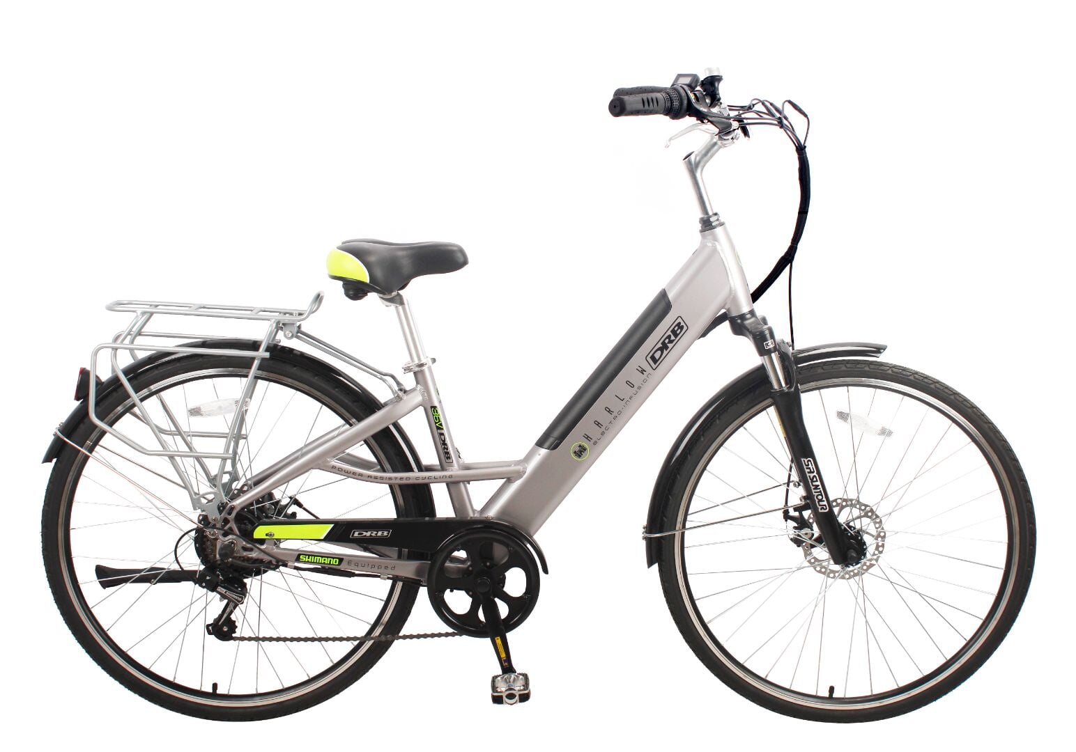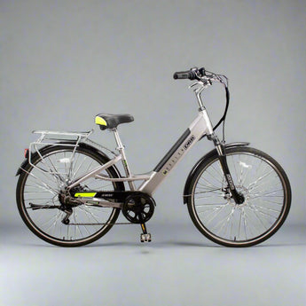 Safety and comfort are top priorities with the Harlow. The Tektro mechanical disc brakes offer responsive stopping power, essential for urban riding, while Shimano’s 6-speed gearing allows you to effortlessly adjust to different inclines and paces. Enhanced with practical features like a rear rack, mudguards, and an enclosed chainguard, this bike offers a polished experience and a stylish satin silver finish for a modern look.