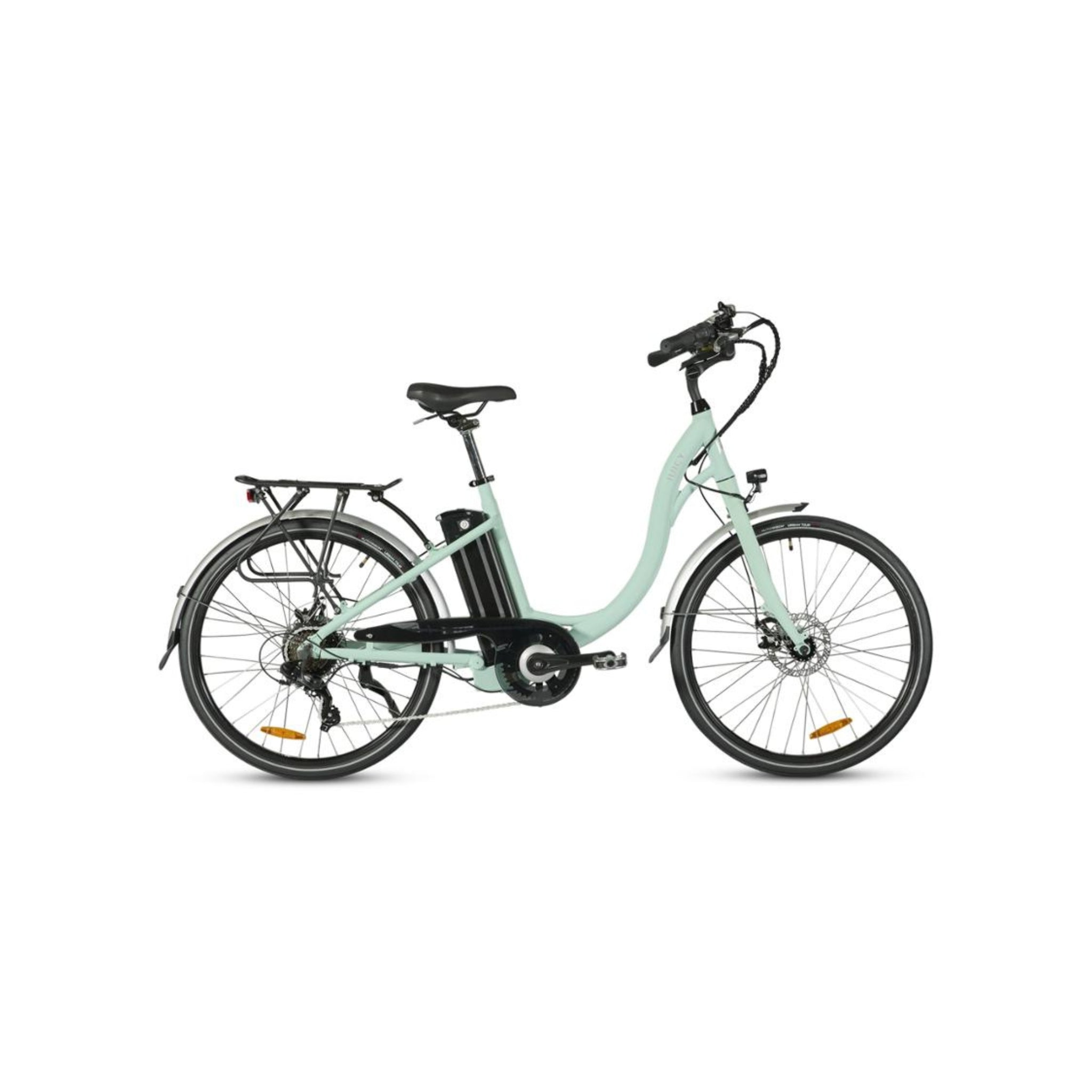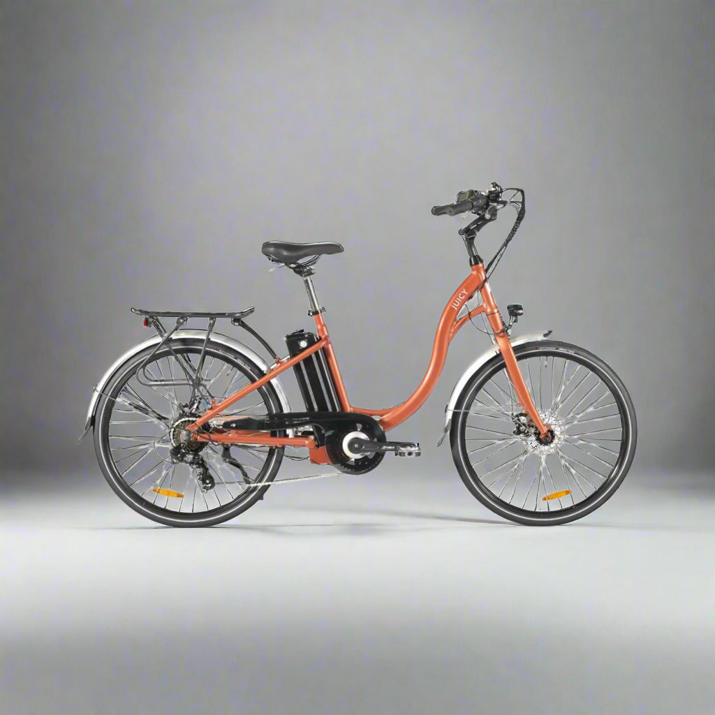 Effortlessly stylish and incredibly practical, the Juicy Bike Classic Bracken Electric Bike combines timeless Dutch-style elegance with modern e-bike performance. Designed for a relaxed, upright riding position, this step-through electric bike offers supreme comfort, making every journey a pleasure. Whether you're commuting through the city or enjoying a leisurely countryside ride, the Classic turns heads with its iconic retro design while delivering smooth, effortless pedalling.